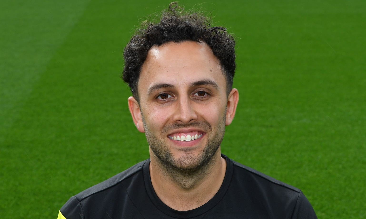 Essex graduate Perry Blanchette sitting on a football pitch, smiling at the camera.