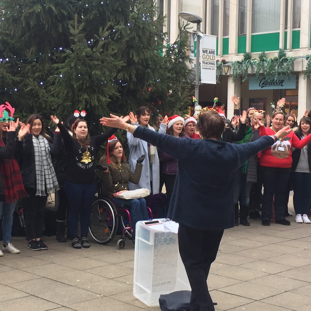 More than 40 MSc Speech and Language Therapy students gathered at our Colchester Campus to entertain staff and students - and raise money for Dementia Adventure - by singing festive songs and signing them using Makaton, a simpler version of British Sign Language.