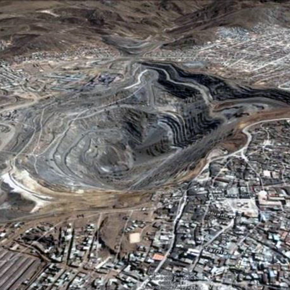 Cerro de Pasco, a city of approximately 70,000 inhabitants, sits on a plateau 4,380 metres above sea level. The city encircles the mining crater, with the mine’s ore stockpiles and waste rock dumps also in the vicinity.